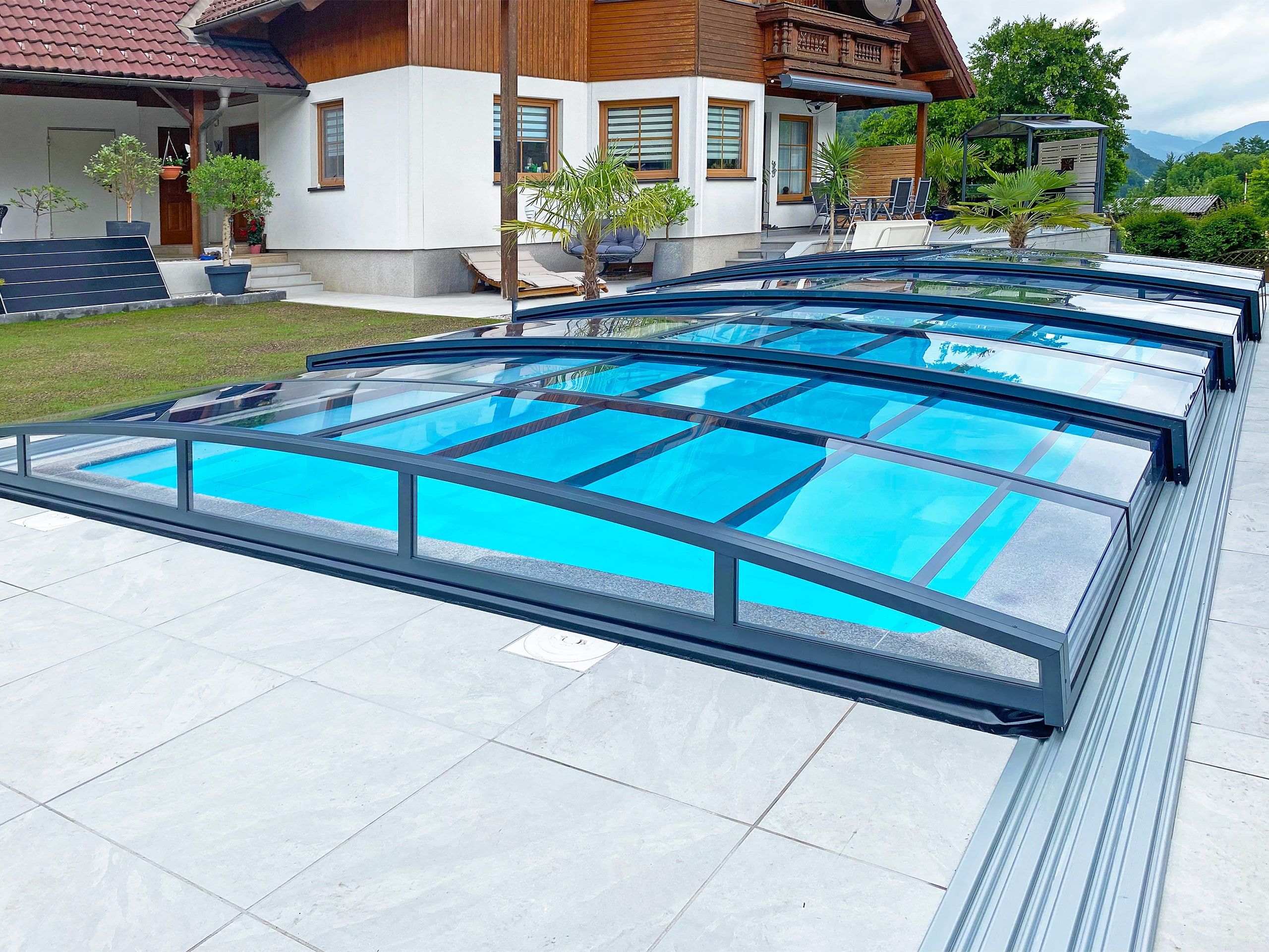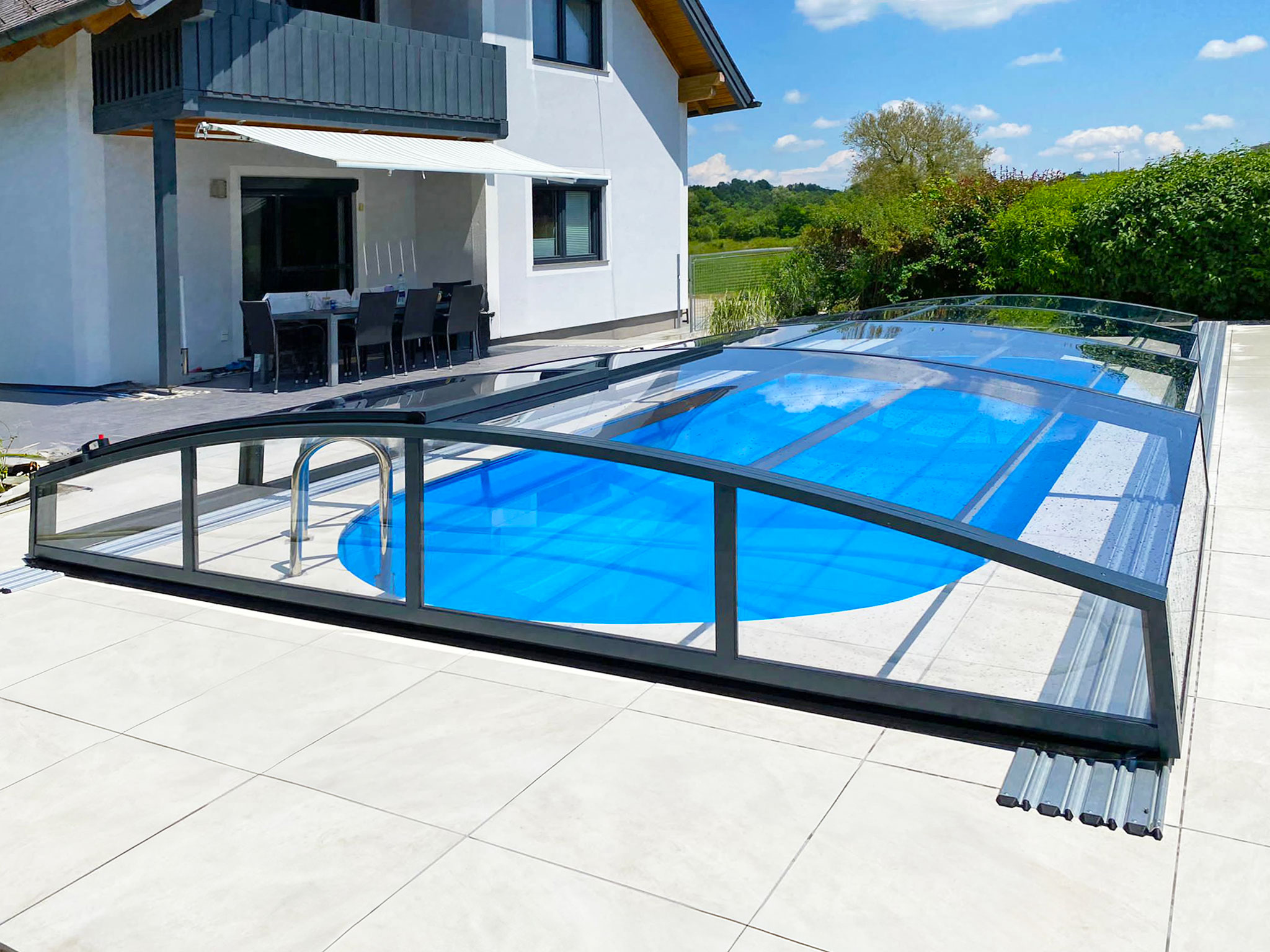 Decentní výška zastřešení Tropic vám nebrání ve výhledu na terasu či zahradu, a přitom stále umožňuje koupání pod zavřeným krytem.