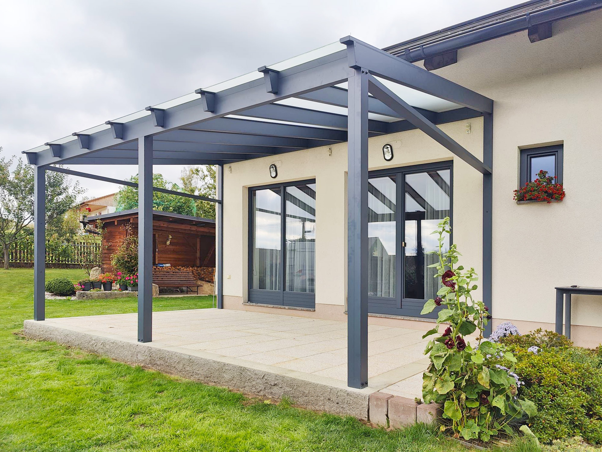 Unsere Terrassenüberdachungen sind aus hochbelastbaren tragenden Aluminiumprofilen gefertigt, die Ihnen einen stabilen Unterstand ohne Kompromisse bieten. Ein festes Dach aus Polycarbonat oder Glas schützt Sie ideal beim Entspannen oder für die Gartenparty. Die Farbvielfalt ermöglicht es, Pavillon oder Pergola an das Aussehen jedes Hauses anzupassen. Die Variabilität der Schiebeelemente bei einem Pavillon bietet Ihnen windgeschützte Ruhebereiche oder an heißen Sommertagen den dringend benötigten Frischluftzufluss. Mehrkammer-Polycarbonat bietet einen effektiven Hitzeschutz gegen direkte Sonneneinstrahlung und lässt gleichzeitig ausreichend Licht in den Raum unter dem Dach. Das ESG-Sicherheitsglas sorgt dafür, dass bei einem Unfall keine Verletzungen für Ihre Liebsten entstehen.