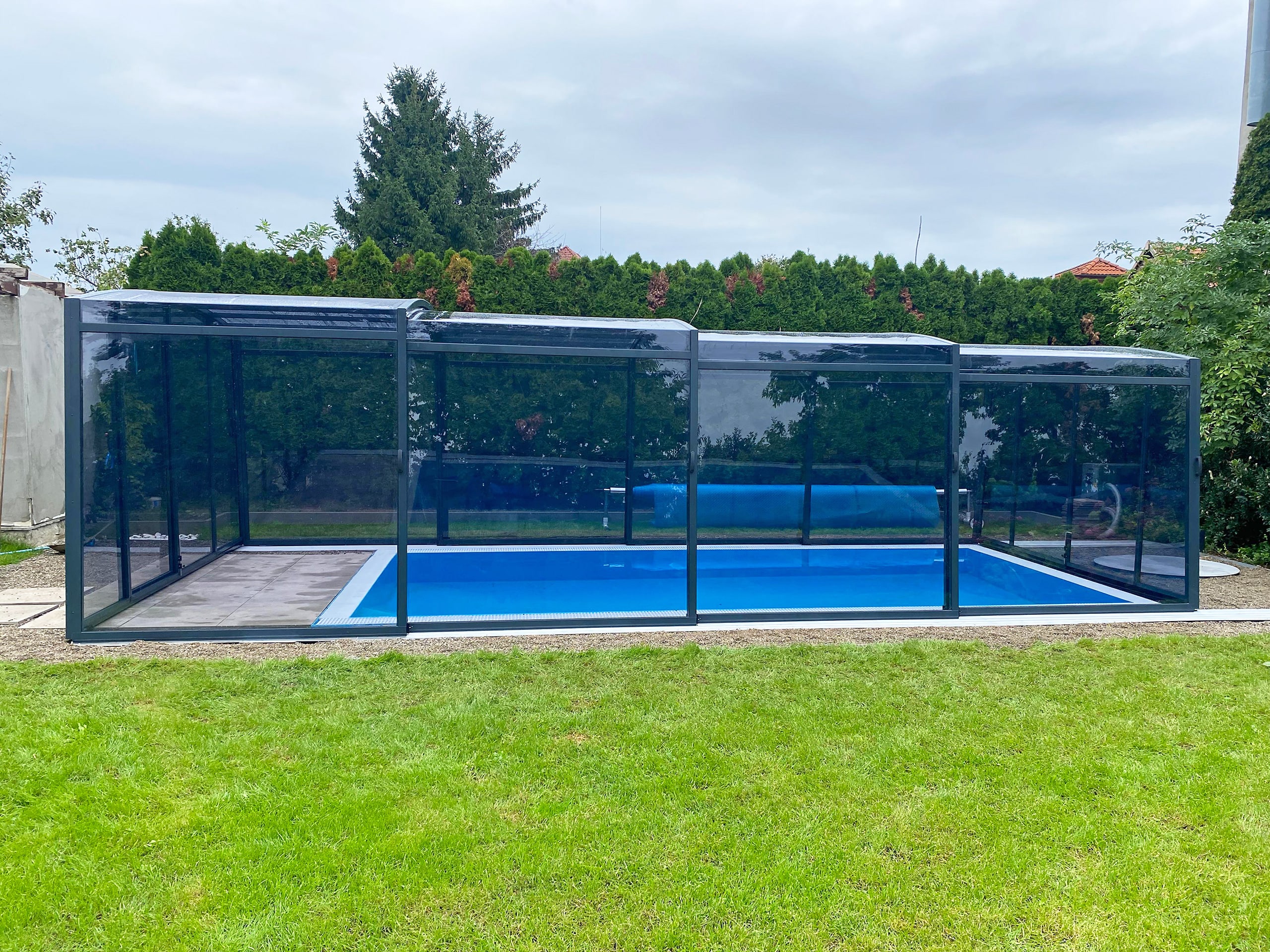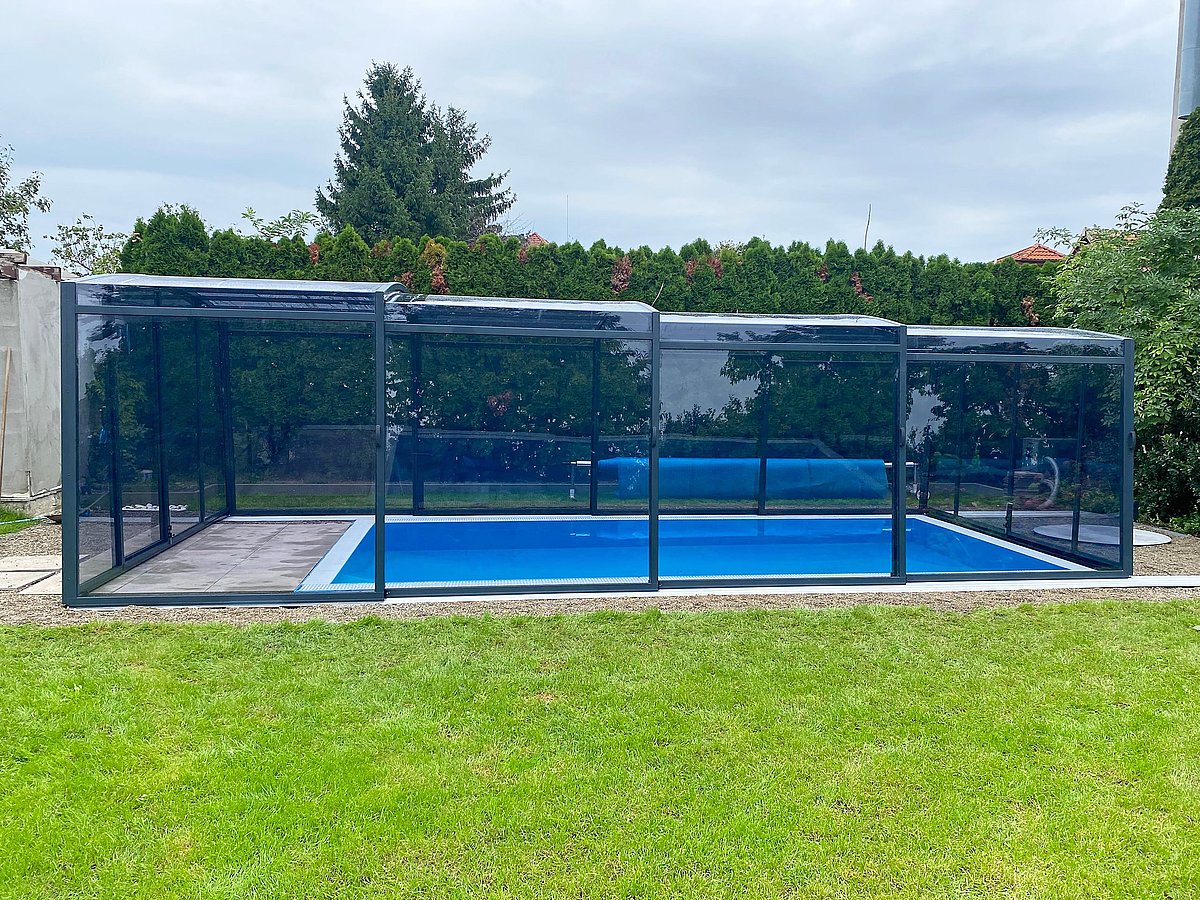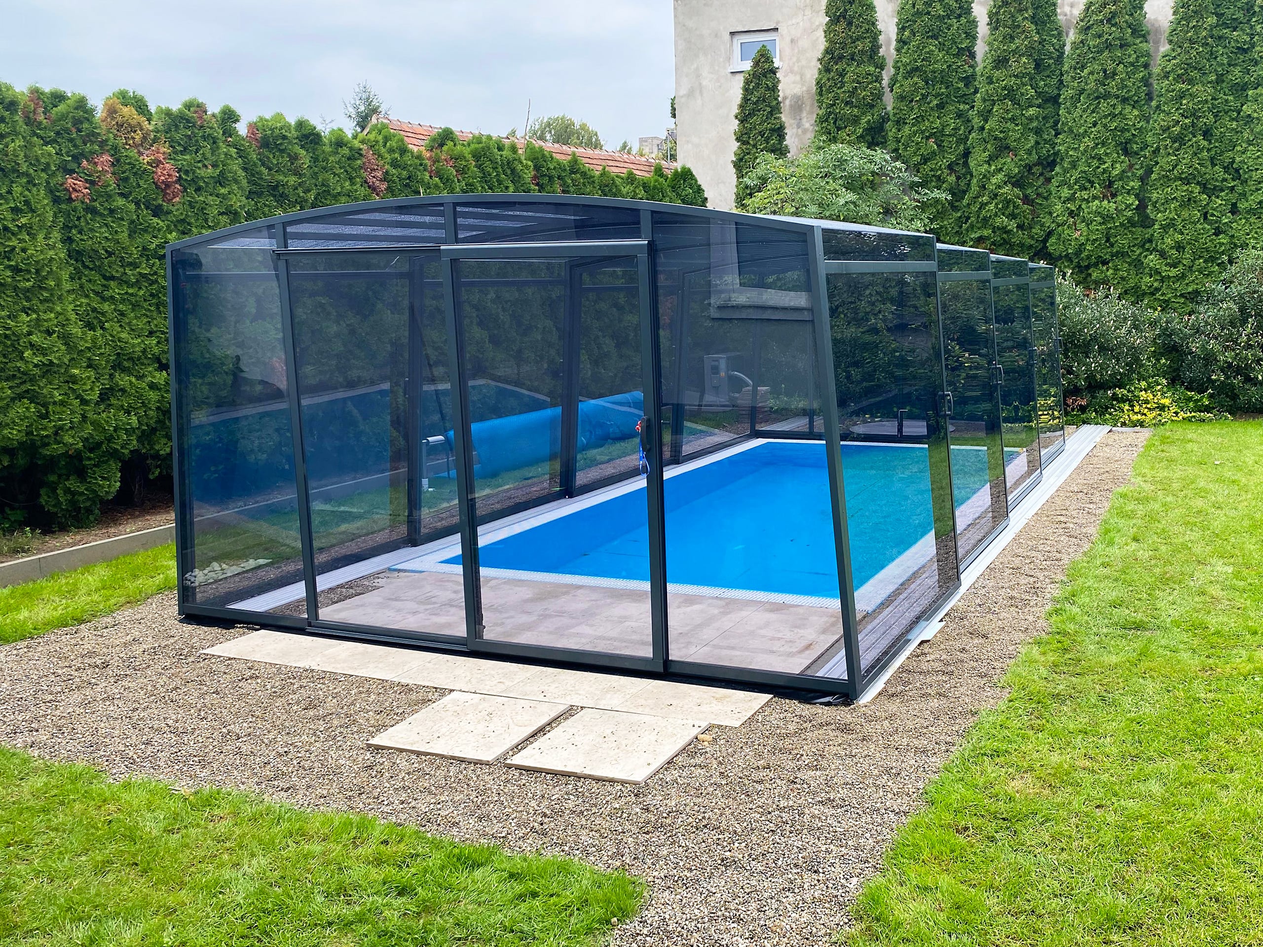 In Kombination mit einer Wärmepumpe kann diese Überdachung das ganze Jahr über genutzt werden. Eine besonders beliebte Kombination ist die dunkle Ausführung des Tropic-Modells mit klarem oder grauem Vollpolycarbonat – sie harmoniert hervorragend mit dem aktuellen Trend zu anthrazitfarbenen Fensterrahmen bei Einfamilienhäusern. Für ambitionierte Heimwerker bietet sich zudem die Möglichkeit, diese Überdachung als Wintergarten zu nutzen – durch Verbindung von Haus und Pool.
