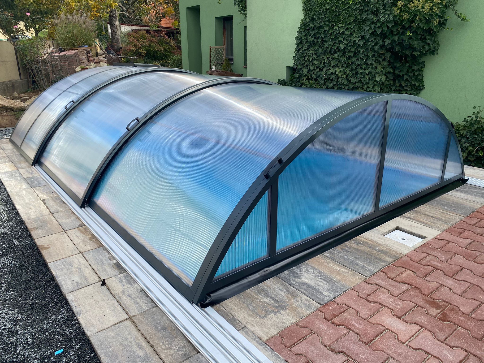 Zastřešení Basic má typický obloukový tvar bez zbytečných hran a předělů. V základním provedení jej dostanete ve stříbrné konstrukci s dutinkovým polykarbonátem, v rozměrech odpovídajících vašemu bazénu. Za příplatek si můžete zvolit plný polykarbonát či jiné barevné provedení.