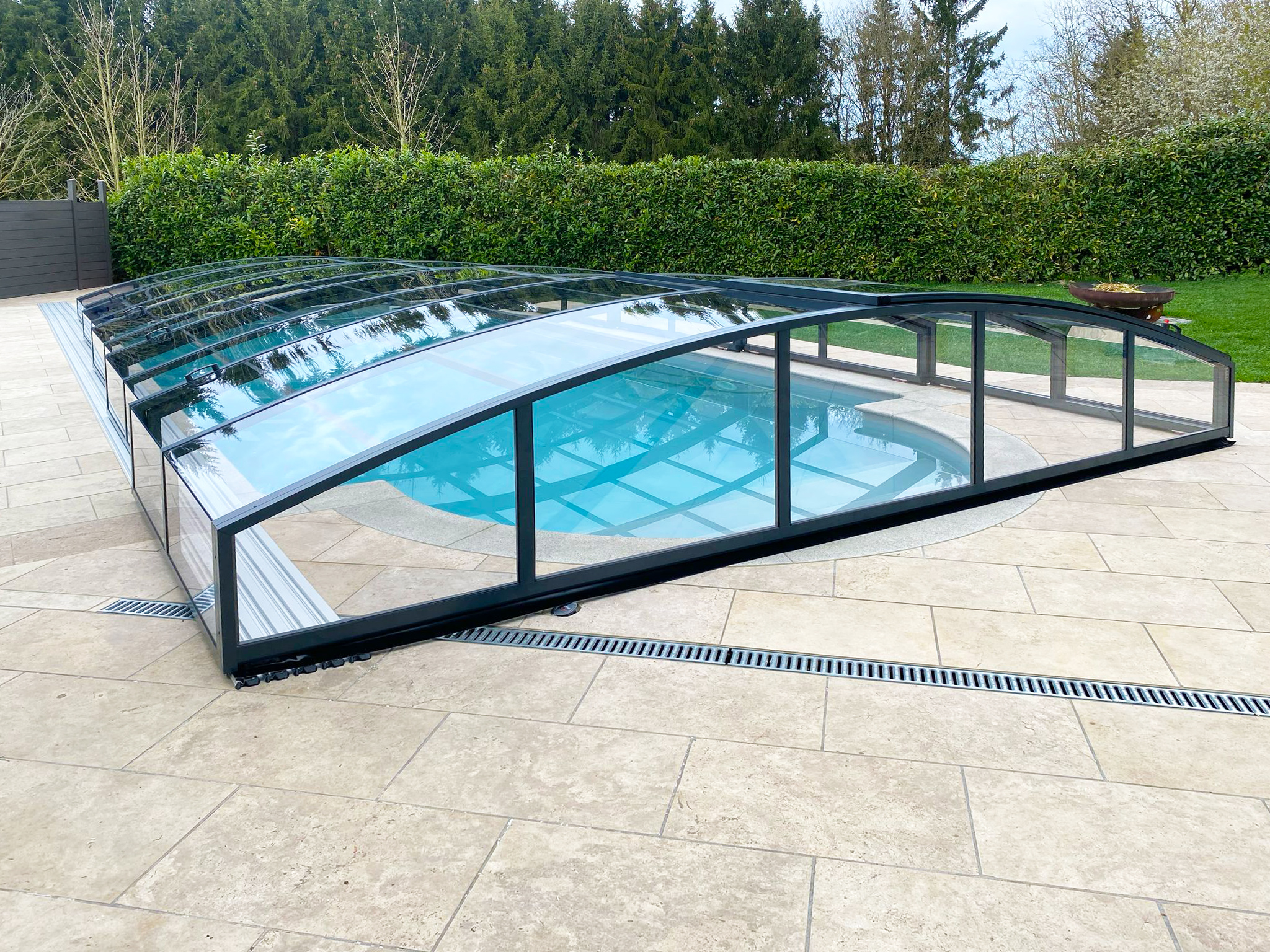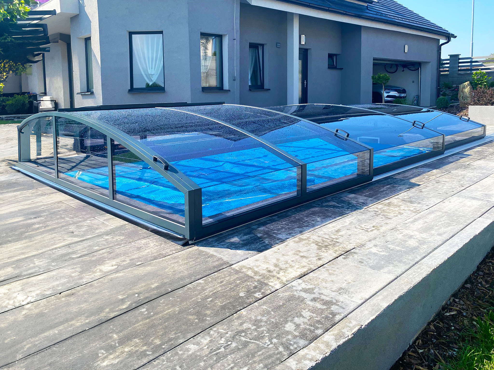 Decentní výška zastřešení Tropic vám nebrání ve výhledu na terasu či zahradu, a přitom stále umožňuje koupání pod zavřeným krytem.