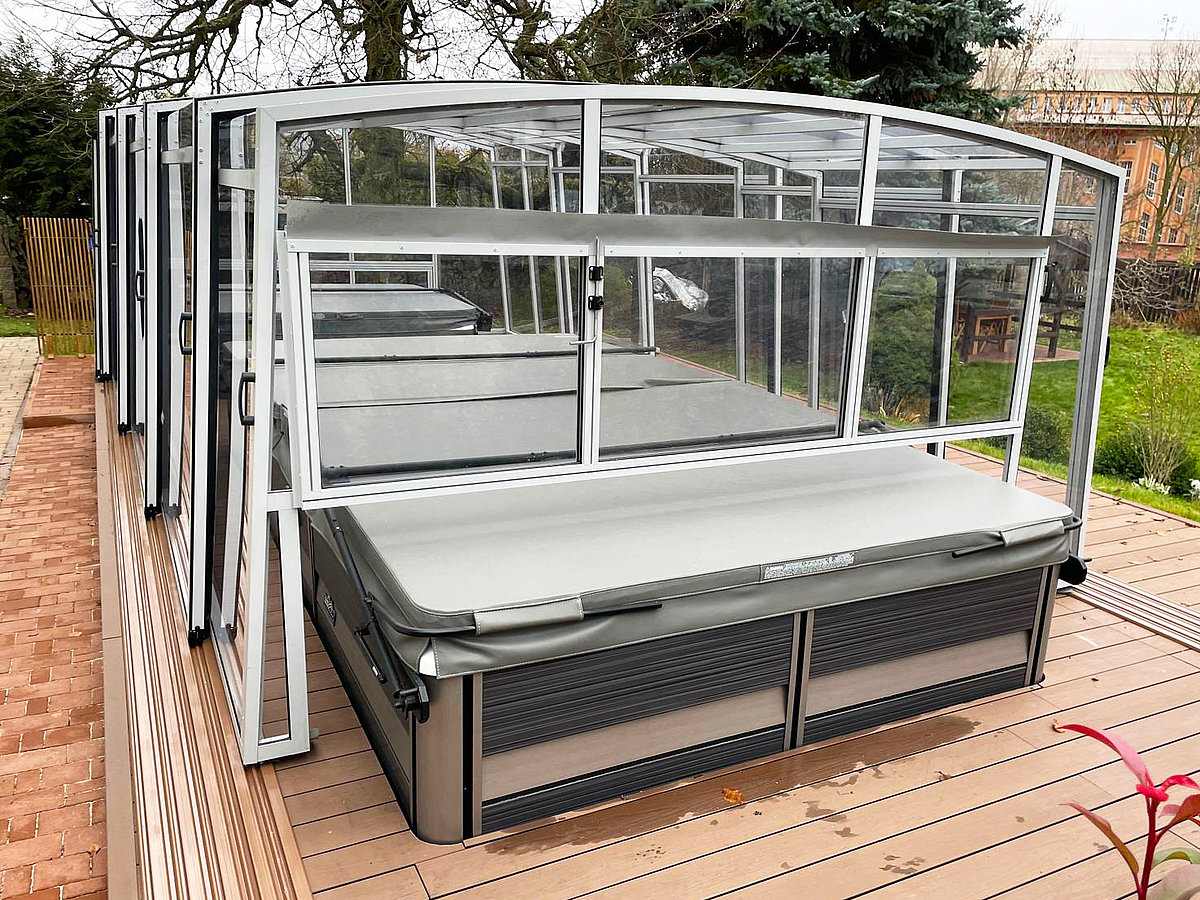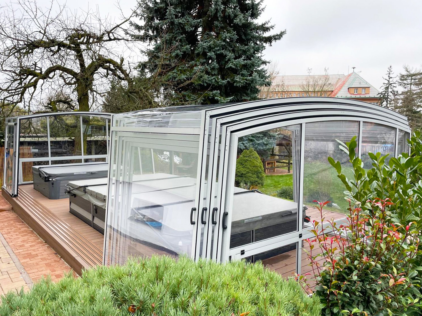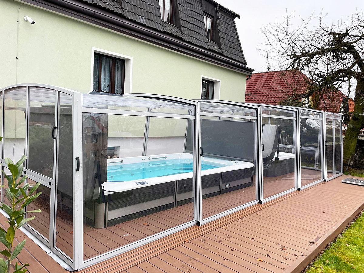Nejvyšší zastřešení - Tropic vysoký je novinkou roku 2025. Toto zastřešení umožňuje svobodný pohyb po celém obvodu bazénu pod zavřeným krytem. Navíc získáte nedocenitelný komfort při koupání a převlékání za jakéhokoliv počasí.